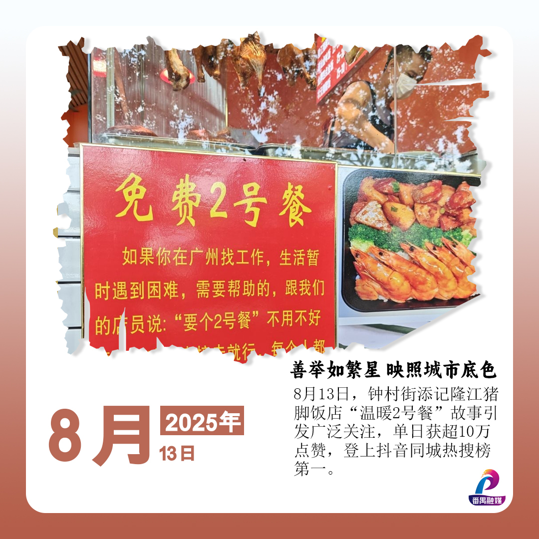 8月13日,钟村街添记隆江猪脚饭店“温暖2号餐”故事引发广泛关注,单日获超10万点赞,登上抖音同城热搜榜第一。