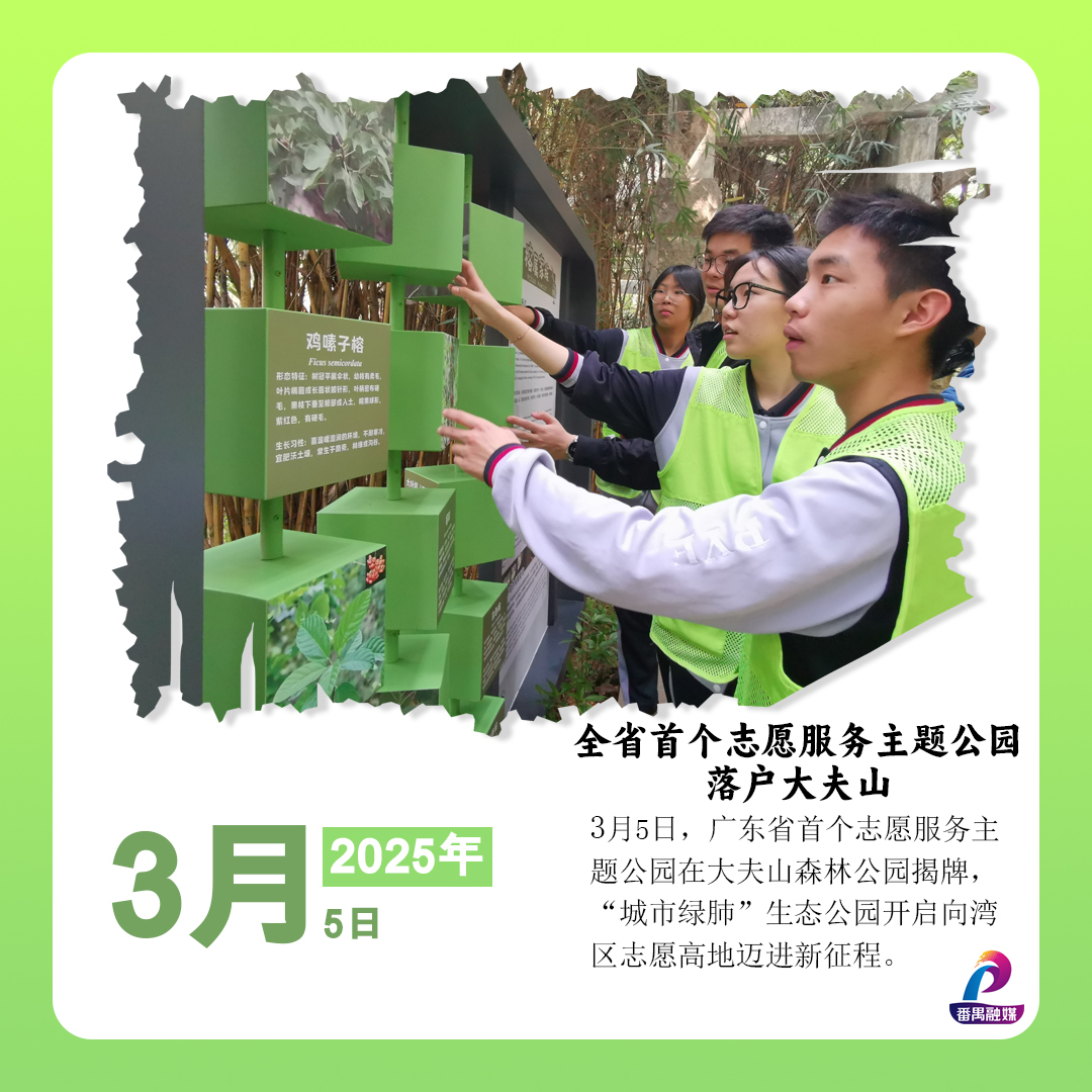 3月5日,广东省首个志愿服务主题公园在大夫山森林公园揭牌,“城市绿肺”生态公园开启向湾区志愿高地迈进新征程;