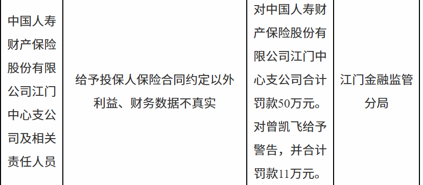 1月5日,国家金融监督管理总局江门监管分局行政处罚信息公示列表显示哪家证券公司最正规,中国人寿财产保险股份有限公司江门中心支公司及相关责任人员因给予投保人保险合同约定以外利益、财务数据不真实被罚款50万元。曾某飞被给予警告并罚款11万元。